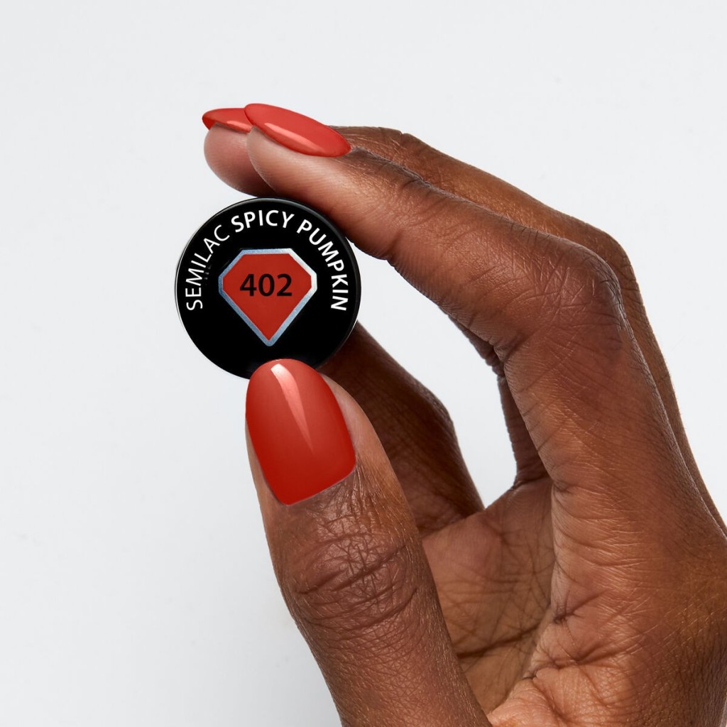 Nałóż cienką warstwę lakieru na wcześniej utwardzoną bazę hybrydową, a następnie użyj lampy UV LED do jego utwardzenia. Unikaj bezpośredniego nakładania na płytkę paznokcia. Aby uzyskać pożądany rezultat kolorystyczny, aplikację można powtórzyć. Wykończ stylizację, nakładając i utwardzając Semilac Top No Wipe Real Color. Dla osiągnięcia najbardziej wyrazistego koloru, warto nałożyć go na jasną bazę.